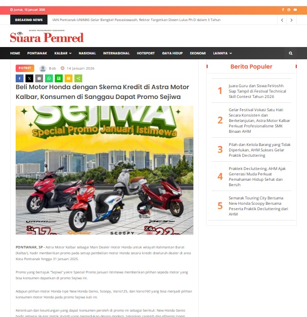 Beli Motor Honda dengan Skema Kredit di Astra Motor Kalbar, Konsumen di Sanggau Dapat Promo Sejiwa by masmul 14 Januari 2026 in Silahkan kunjungi https://www.suarapemredkalbar.com/read/potret/14012026/beli-motor-honda-dengan-skema-kredit-di-astra-motor-kalbar-konsumen-di-sanggau-dapat-promo-sejiwa. You Might Like Regional Public Launching New ADV160 The SUV Pride Grand Launching New PCX 160 Truly Exceptional! Tetap hati-hati ya bro sist berkendara saat hujan.
