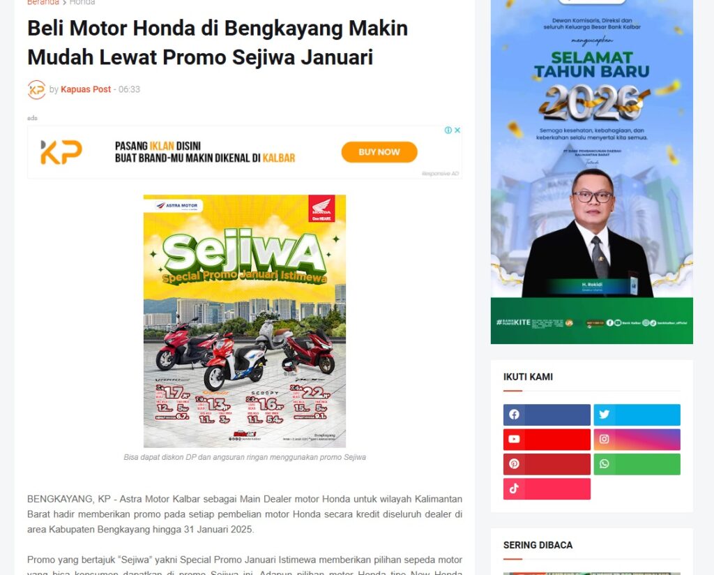 Beli Motor Honda di Bengkayang Makin Mudah Lewat Promo Sejiwa Januari by Muhammad Arif 11 Januari 2026 in Silahkan kunjungi https://www.kapuaspost.web.id/2026/01/beli-motor-honda-di-bengkayang-makin.html. Tags: astra Astra Motor kalbar Astra Motor Pontianak astramotor honda kalbar pontianak sepeda motor You Might Like Regional Public Launching New ADV160 The SUV Pride Grand Launching New PCX 160 Truly Exceptional! Tetap hati-hati ya bro sist berkendara saat hujan.