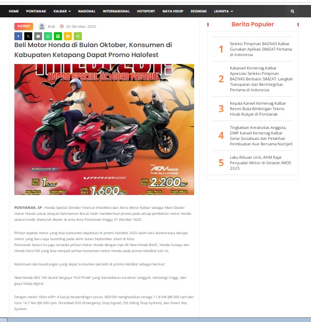Beli Motor Honda di Bulan Oktober, Konsumen di Kabupaten Ketapang Dapat Promo Halofest by masmul 20 Oktober 2025 in Silahkan kunjungi https://www.suarapemredkalbar.com/read/potret/20102025/beli-motor-honda-di-bulan-oktober-konsumen-di-kabupaten-ketapang-dapat-promo-halofest. You Might Like Regional Public Launching New ADV160 The SUV Pride Grand Launching New PCX 160 Truly Exceptional! Tetap hati-hati ya bro sist berkendara saat hujan.