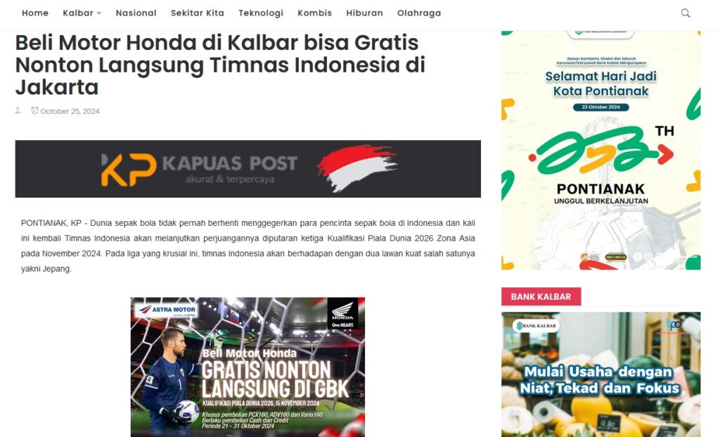 Beli Motor Honda di Kalbar bisa Gratis Nonton Langsung Timnas Indonesia di Jakarta by Muhammad Arif 25 Oktober 2024 in Silahkan kunjungi https://www.kapuaspost.web.id/2024/10/beli-motor-honda-di-kalbar-bisa-gratis.html. Tags: astra Astra Motor kalbar Astra Motor Pontianak astramotor honda kalbar pontianak sepeda motor You Might Like Regional Public Launching New ADV160 The SUV Pride Grand Launching New PCX 160 Truly Exceptional! Tetap hati-hati ya bro sist berkendara saat hujan.