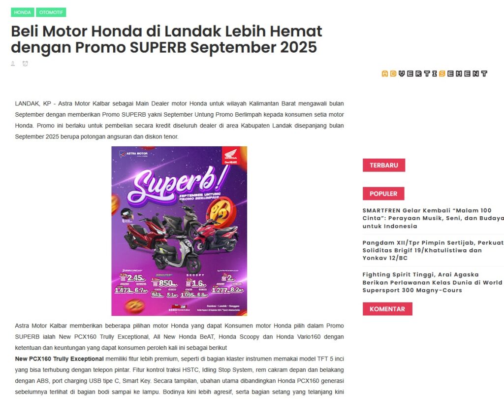 Beli Motor Honda di Landak Lebih Hemat dengan Promo SUPERB September 2025 by Muhammad Arif 10 September 2025 in Silahkan kunjungi https://www.kapuaspost.web.id/2025/09/beli-motor-honda-di-landak-lebih-hemat.html. Tags: astra Astra Motor kalbar Astra Motor Pontianak astramotor honda kalbar pontianak sepeda motor You Might Like Regional Public Launching New ADV160 The SUV Pride Grand Launching New PCX 160 Truly Exceptional! Tetap hati-hati ya bro sist berkendara saat hujan.
