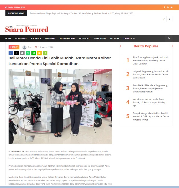 Beli Motor Honda Kini Lebih Mudah, Astra Motor Kalbar Luncurkan Promo Spesial Ramadhan by masmul 19 Maret 2026 in Silahkan kunjungi https://www.suarapemredkalbar.com/read/potret/19032026/beli-motor-honda-kini-lebih-mudah-astra-motor-kalbar-luncurkan-promo-spesial-ramadhan. You Might Like Regional Public Launching New ADV160 The SUV Pride Grand Launching New PCX 160 Truly Exceptional! Tetap hati-hati ya bro sist berkendara saat hujan.