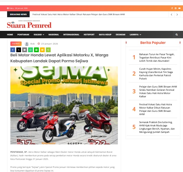 Beli Motor Honda Lewat Aplikasi Motorku X, Warga Kabupaten Landak Dapat Pormo Sejiwa by masmul 23 Januari 2026 in Silahkan kunjungi https://www.suarapemredkalbar.com/read/potret/23012026/beli-motor-honda-lewat-aplikasi-motorku-x-warga-kabupaten-landak-dapat-pormo-sejiwa. You Might Like Regional Public Launching New ADV160 The SUV Pride Grand Launching New PCX 160 Truly Exceptional! Tetap hati-hati ya bro sist berkendara saat hujan.