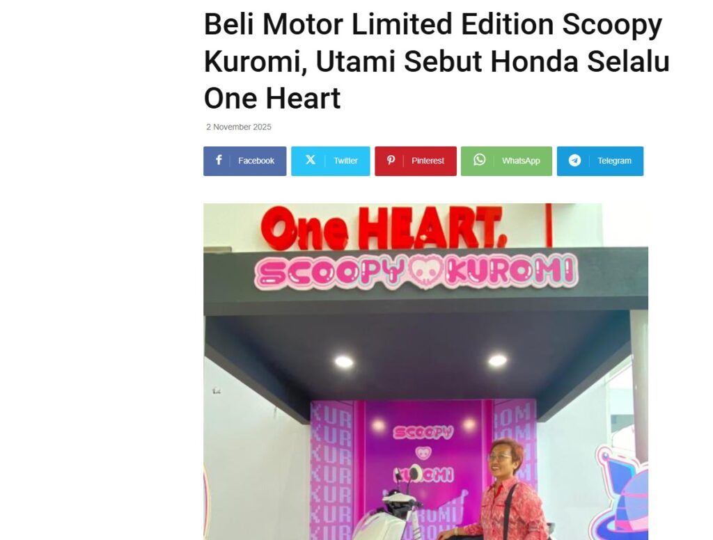 Beli Motor Limited Edition Scoopy Kuromi, Utami Sebut Honda Selalu One Heart by Nova Sari 2 November 2025 in Silahkan kunjungi https://equator.co.id/beli-motor-limited-edition-scoopy-kuromi-utami-sebut-honda-selalu-one-heart/. You Might Like Regional Public Launching New ADV160 The SUV Pride Grand Launching New PCX 160 Truly Exceptional! Tetap hati-hati ya bro sist berkendara saat hujan.