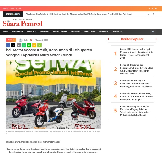 Beli Motor Secara Kredit, Konsumen di Kabupaten Sanggau Apresiasi Astra Motor Kalbar by masmul 17 Januari 2026 in Silahkan kunjungi https://www.suarapemredkalbar.com/read/potret/17012026/beli-motor-secara-kredit-konsumen-di-kabupaten-sanggau-apresiasi-astra-motor-kalbar. You Might Like Regional Public Launching New ADV160 The SUV Pride Grand Launching New PCX 160 Truly Exceptional! Tetap hati-hati ya bro sist berkendara saat hujan.