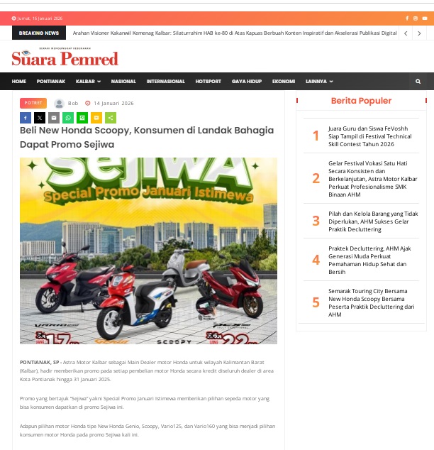 Beli New Honda Scoopy, Konsumen di Landak Bahagia Dapat Promo Sejiwa by masmul 14 Januari 2026 in Silahkan kunjungi https://www.suarapemredkalbar.com/read/potret/14012026/beli-new-honda-scoopy-konsumen-di-landak-bahagia-dapat-promo-sejiwa. You Might Like Regional Public Launching New ADV160 The SUV Pride Grand Launching New PCX 160 Truly Exceptional! Tetap hati-hati ya bro sist berkendara saat hujan.