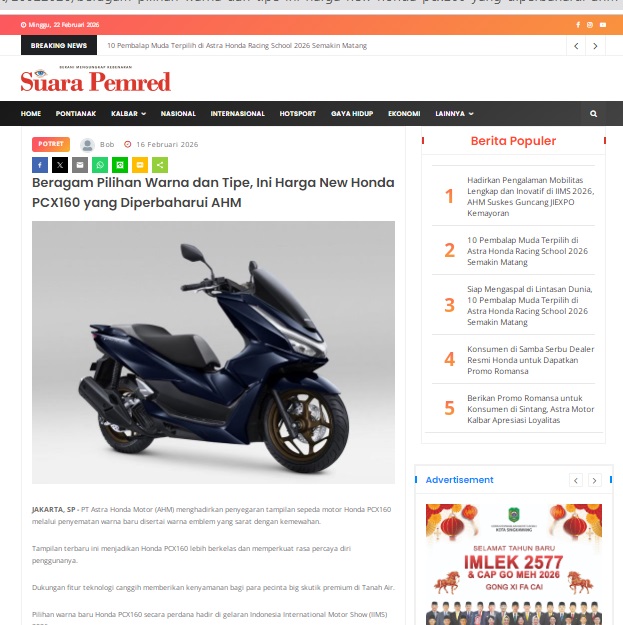 Beragam Pilihan Warna dan Tipe, Ini Harga New Honda PCX160 yang Diperbaharui AHM by masmul 16 Februari 2026 in Silahkan kunjungi https://www.suarapemredkalbar.com/read/potret/16022026/beragam-pilihan-warna-dan-tipe-ini-harga-new-honda-pcx160-yang-diperbaharui-ahm. You Might Like Regional Public Launching New ADV160 The SUV Pride Grand Launching New PCX 160 Truly Exceptional! Tetap hati-hati ya bro sist berkendara saat hujan.