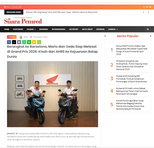Berangkat ke Barselona, Mario dan Veda Siap Melesat di Grand Prix 2026: Kisah dari AHRS ke Kejuaraan Balap Dunia by masmul 18 Januari 2026 in Silahkan kunjungi https://www.suarapemredkalbar.com/read/potret/18012026/berangkat-ke-barselona-mario-dan-veda-siap-melesat-di-grand-prix-2026-kisah-dari-ahrs-ke-kejuaraan-balap-dunia. You Might Like Regional Public Launching New ADV160 The SUV Pride Grand Launching New PCX 160 Truly Exceptional! Tetap hati-hati ya bro sist berkendara saat hujan.