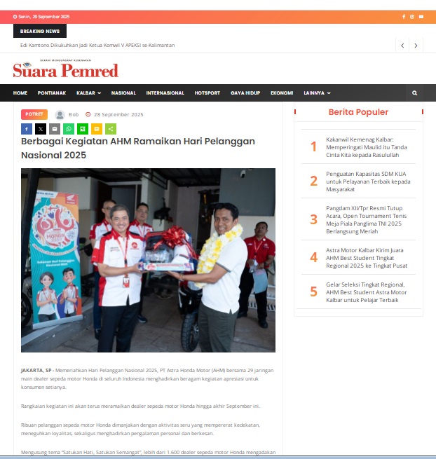 Berbagai Kegiatan AHM Ramaikan Hari Pelanggan Nasional 2025 by masmul 28 September 2025 in Silahkan kunjungi https://www.suarapemredkalbar.com/read/potret/28092025/berbagai-kegiatan-ahm-ramaikan-hari-pelanggan-nasional-2025. You Might Like Regional Public Launching New ADV160 The SUV Pride Grand Launching New PCX 160 Truly Exceptional! Tetap hati-hati ya bro sist berkendara saat hujan.