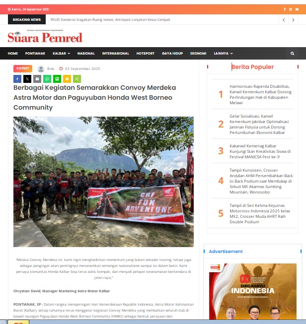 Berbagai Kegiatan Semarakkan Convoy Merdeka Astra Motor dan Paguyuban Honda West Borneo Community by masmul 3 September 2025 in Silahkan kunjungi https://www.suarapemredkalbar.com/read/potret/03092025/berbagai-kegiatan-semarakkan-convoy-merdeka-astra-motor-dan-paguyuban-honda-west-borneo-community. You Might Like Regional Public Launching New ADV160 The SUV Pride Grand Launching New PCX 160 Truly Exceptional! Tetap hati-hati ya bro sist berkendara saat hujan.