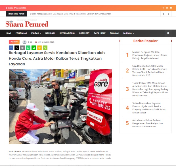 Berbagai Layanan Servis Kendalaan Diberikan oleh Honda Care, Astra Motor Kalbar Terus Tingkatkan Layanan by masmul 21 Januari 2026 in Silahkan kunjungi https://www.suarapemredkalbar.com/read/potret/21012026/berbagai-layanan-servis-kendalaan-diberikan-oleh-honda-care-astra-motor-kalbar-terus-tingkatkan-layanan. You Might Like Regional Public Launching New ADV160 The SUV Pride Grand Launching New PCX 160 Truly Exceptional! Tetap hati-hati ya bro sist berkendara saat hujan.