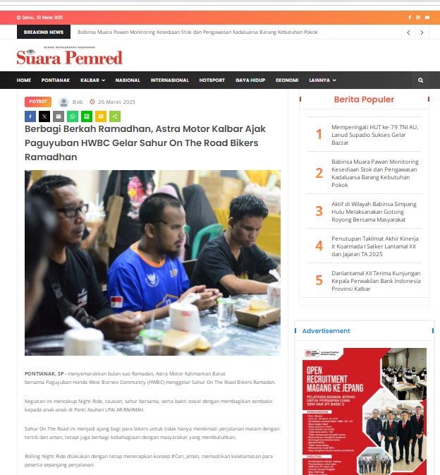 Berbagi Berkah Ramadhan, Astra Motor Kalbar Ajak Paguyuban HWBC Gelar Sahur On The Road Bikers Ramadhan by masmul 20 Maret 2025 in Silahkan kunjungi https://www.suarapemredkalbar.com/read/potret/20032025/berbagi-berkah-ramadhan-astra-motor-kalbar-ajak-paguyuban-hwbc-gelar-sahur-on-the-road-bikers-ramadhan. You Might Like Regional Public Launching New ADV160 The SUV Pride Grand Launching New PCX 160 Truly Exceptional! Tetap hati-hati ya bro sist berkendara saat hujan.