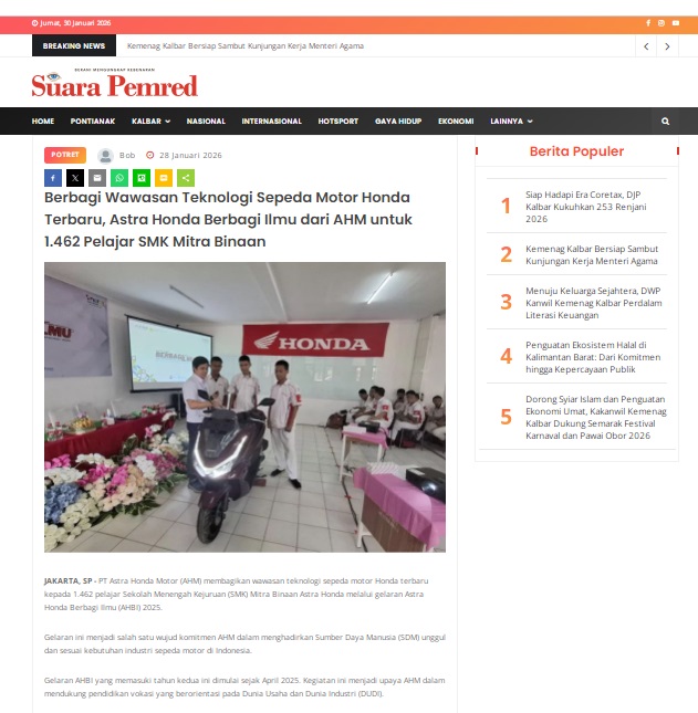 Berbagi Wawasan Teknologi Sepeda Motor Honda Terbaru, Astra Honda Berbagi Ilmu dari AHM untuk 1.462 Pelajar SMK Mitra Binaan by masmul 28 Januari 2026 in Silahkan kunjungi https://www.suarapemredkalbar.com/read/potret/28012026/berbagi-wawasan-teknologi-sepeda-motor-honda-terbaru-astra-honda-berbagi-ilmu-dari-ahm-untuk-1462-pelajar-smk-mitra-binaan. You Might Like Regional Public Launching New ADV160 The SUV Pride Grand Launching New PCX 160 Truly Exceptional! Tetap hati-hati ya bro sist berkendara saat hujan.