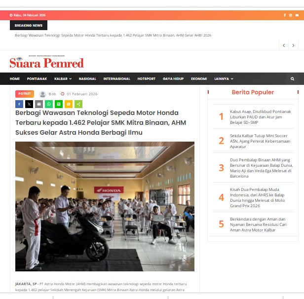 Berbagi Wawasan Teknologi Sepeda Motor Honda Terbaru kepada 1.462 Pelajar SMK Mitra Binaan, AHM Sukses Gelar Astra Honda Berbagi Ilmu by masmul 1 Februari 2026 in Silahkan kunjungi https://www.suarapemredkalbar.com/read/potret/01022026/berbagi-wawasan-teknologi-sepeda-motor-honda-terbaru-kepada-1462-pelajar-smk-mitra-binaan-ahm-sukses-gelar-astra-honda-berbagi-ilmu. You Might Like Regional Public Launching New ADV160 The SUV Pride Grand Launching New PCX 160 Truly Exceptional! Tetap hati-hati ya bro sist berkendara saat hujan.