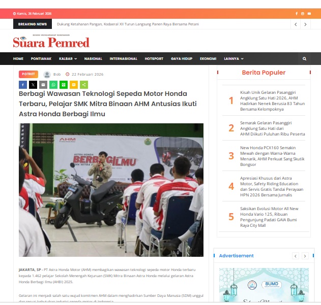 Berbagi Wawasan Teknologi Sepeda Motor Honda Terbaru, Pelajar SMK Mitra Binaan AHM Antusias Ikuti Astra Honda Berbagi Ilmu by masmul 22 Februari 2026 in Silahkan kunjungi https://www.suarapemredkalbar.com/read/potret/22022026/berbagi-wawasan-teknologi-sepeda-motor-honda-terbaru-pelajar-smk-mitra-binaan-ahm-antusias-ikuti-astra-honda-berbagi-ilmu. You Might Like Regional Public Launching New ADV160 The SUV Pride Grand Launching New PCX 160 Truly Exceptional! Tetap hati-hati ya bro sist berkendara saat hujan.