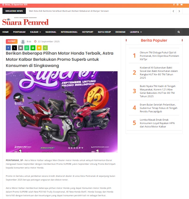 Berikan Beberapa Pilihan Motor Honda Terbaik, Astra Motor Kalbar Berlakukan Promo Superb untuk Konsumen di Singkawang by masmul 22 September 2025 in Silahkan kunjungi https://www.suarapemredkalbar.com/read/potret/22092025/berikan-beberapa-pilihan-motor-honda-terbaik-astra-motor-kalbar-berlakukan-promo-superb-untuk-konsumen-di-singkawang. You Might Like Regional Public Launching New ADV160 The SUV Pride Grand Launching New PCX 160 Truly Exceptional! Tetap hati-hati ya bro sist berkendara saat hujan.
