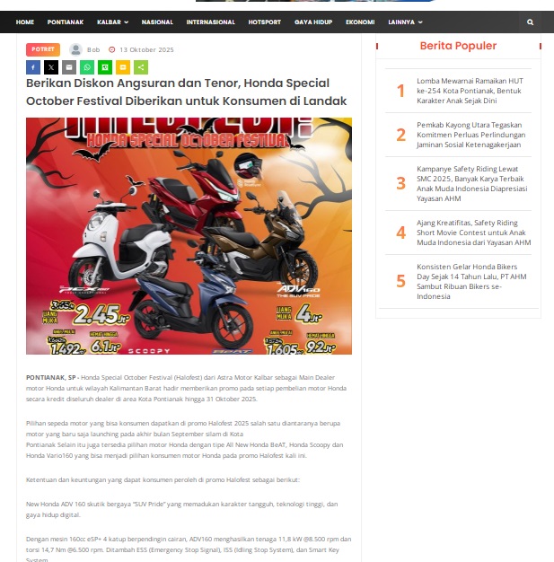 Berikan Diskon Angsuran dan Tenor, Honda Special October Festival Diberikan untuk Konsumen di Landak by masmul 13 Oktober 2025 in Silahkan kunjungi https://www.suarapemredkalbar.com/read/potret/13102025/berikan-diskon-angsuran-dan-tenor-honda-special-october-festival-diberikan-untuk-konsumen-di-landak. You Might Like Regional Public Launching New ADV160 The SUV Pride Grand Launching New PCX 160 Truly Exceptional! Tetap hati-hati ya bro sist berkendara saat hujan.