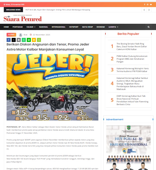 Berikan Diskon Angsuran dan Tenor, Promo Jeder Astra Motor Kalbar Manjakan Konsumen Loyal by masmul 22 November 2025 in Silahkan kunjungi https://www.suarapemredkalbar.com/read/potret/22112025/berikan-diskon-angsuran-dan-tenor-promo-jeder-astra-motor-kalbar-manjakan-konsumen-loyal. You Might Like Regional Public Launching New ADV160 The SUV Pride Grand Launching New PCX 160 Truly Exceptional! Tetap hati-hati ya bro sist berkendara saat hujan.