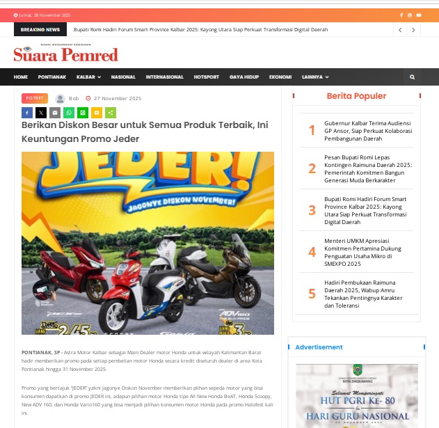 Berikan Diskon Besar untuk Semua Produk Terbaik, Ini Keuntungan Promo Jeder by masmul 28 November 2025 in Silahkan kunjungi https://www.suarapemredkalbar.com/read/potret/27112025/berikan-diskon-besar-untuk-semua-produk-terbaik-ini-keuntungan-promo-jeder. You Might Like Regional Public Launching New ADV160 The SUV Pride Grand Launching New PCX 160 Truly Exceptional! Tetap hati-hati ya bro sist berkendara saat hujan.