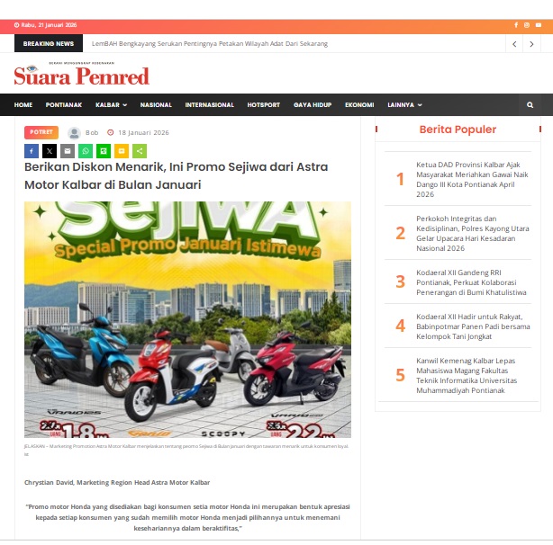 Berikan Diskon Menarik, Ini Promo Sejiwa dari Astra Motor Kalbar di Bulan Januari by masmul 18 Januari 2026 in Silahkan kunjungi https://www.suarapemredkalbar.com/read/potret/18012026/berikan-diskon-menarik-ini-promo-sejiwa-dari-astra-motor-kalbar-di-bulan-januari. You Might Like Regional Public Launching New ADV160 The SUV Pride Grand Launching New PCX 160 Truly Exceptional! Tetap hati-hati ya bro sist berkendara saat hujan.