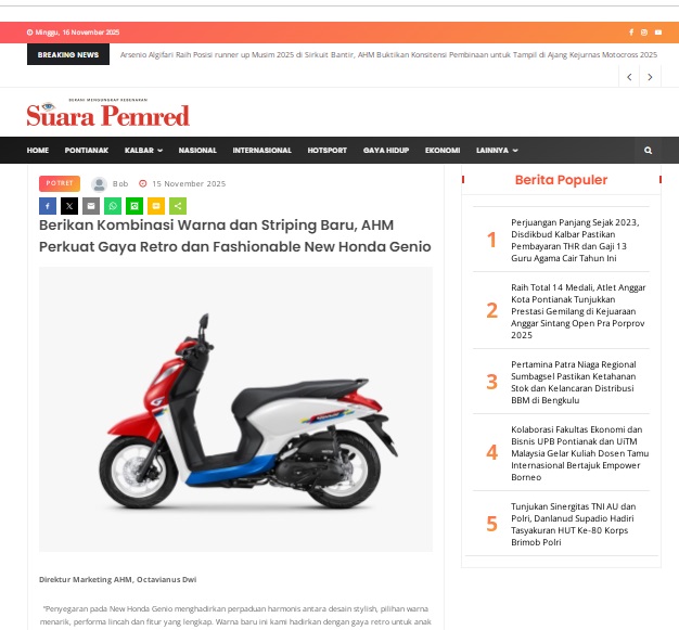 Berikan Kombinasi Warna dan Striping Baru, AHM Perkuat Gaya Retro dan Fashionable New Honda Genio by masmul 15 November 2025 in Silahkan kunjungi https://www.suarapemredkalbar.com/read/potret/15112025/berikan-kombinasi-warna-dan-striping-baru-ahm-perkuat-gaya-retro-dan-fashionable-new-honda-genio. You Might Like Regional Public Launching New ADV160 The SUV Pride Grand Launching New PCX 160 Truly Exceptional! Tetap hati-hati ya bro sist berkendara saat hujan.