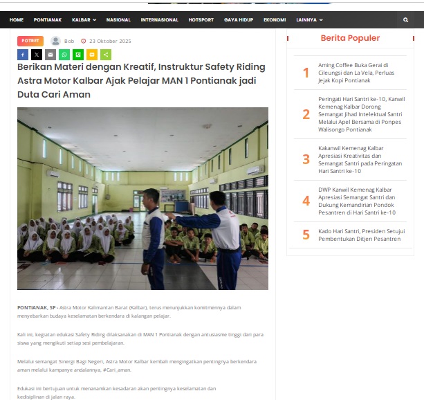 Berikan Materi dengan Kreatif, Instruktur Safety Riding Astra Motor Kalbar Ajak Pelajar MAN 1 Pontianak jadi Duta Cari Aman by masmul 23 Oktober 2025 in Silahkan kunjungi https://www.suarapemredkalbar.com/read/potret/23102025/berikan-materi-dengan-kreatif-instruktur-safety-riding-astra-motor-kalbar-ajak-pelajar-man-1-pontianak-jadi-duta-cari-aman. You Might Like Regional Public Launching New ADV160 The SUV Pride Grand Launching New PCX 160 Truly Exceptional! Tetap hati-hati ya bro sist berkendara saat hujan.
