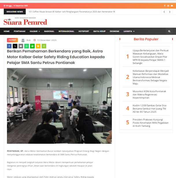 Berikan Pemahaman Berkendara yang Baik, Astra Motor Kalbar Gelar Safety Riding Education kepada Pelajar SMA Santu Petrus Pontianak by masmul 13 Desember 2025 in Silahkan kunjungi https://www.suarapemredkalbar.com/read/potret/13122025/berikan-pemahaman-berkendara-yang-baik-astra-motor-kalbar-gelar-safety-riding-education-kepada-pelajar-sma-santu-petrus-pontianak. You Might Like Regional Public Launching New ADV160 The SUV Pride Grand Launching New PCX 160 Truly Exceptional! Tetap hati-hati ya bro sist berkendara saat hujan.