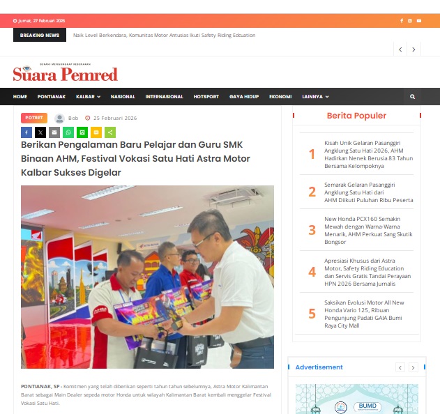 Berikan Pengalaman Baru Pelajar dan Guru SMK Binaan AHM, Festival Vokasi Satu Hati Astra Motor Kalbar Sukses Digelar by masmul 25 Februari 2026 in Silahkan kunjungi https://www.suarapemredkalbar.com/read/potret/25022026/berikan-pengalaman-baru-pelajar-dan-guru-smk-binaan-ahm-festival-vokasi-satu-hati-astra-motor-kalbar-sukses-digelar. You Might Like Regional Public Launching New ADV160 The SUV Pride Grand Launching New PCX 160 Truly Exceptional! Tetap hati-hati ya bro sist berkendara saat hujan.