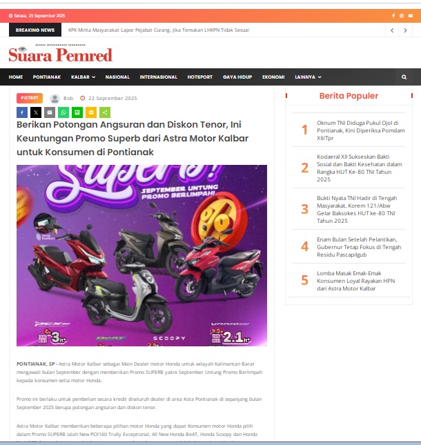 Berikan Potongan Angsuran dan Diskon Tenor, Ini Keuntungan Promo Superb dari Astra Motor Kalbar untuk Konsumen di Pontianak by masmul 22 September 2025 in Silahkan kunjungi https://www.suarapemredkalbar.com/read/potret/22092025/berikan-potongan-angsuran-dan-diskon-tenor-ini-keuntungan-promo-superb-dari-astra-motor-kalbar-untuk-konsumen-di-pontianak. You Might Like Regional Public Launching New ADV160 The SUV Pride Grand Launching New PCX 160 Truly Exceptional! Tetap hati-hati ya bro sist berkendara saat hujan.
