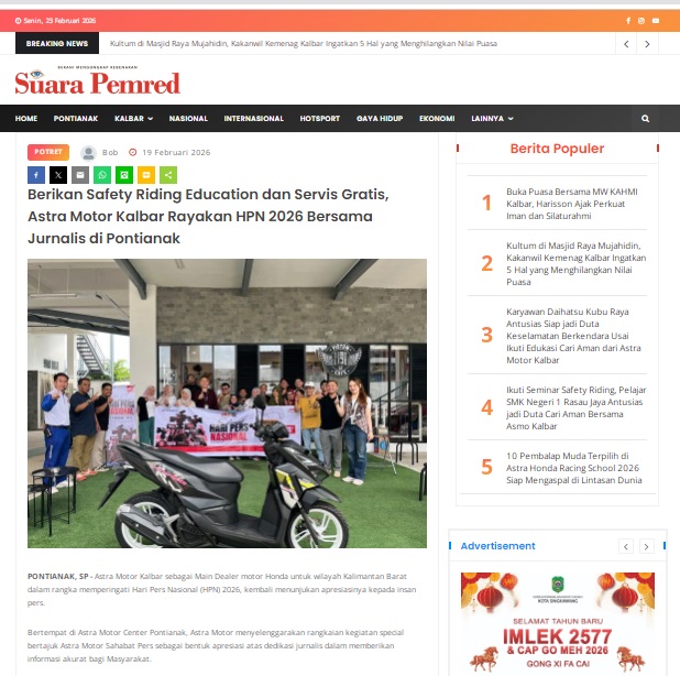 Berikan Safety Riding Education dan Servis Gratis, Astra Motor Kalbar Rayakan HPN 2026 Bersama Jurnalis di Pontianak by masmul 19 Februari 2026 in Silahkan kunjungi https://www.suarapemredkalbar.com/read/potret/19022026/berikan-safety-riding-education-dan-servis-gratis-astra-motor-kalbar-rayakan-hpn-2026-bersama-jurnalis-di-pontianak. You Might Like Regional Public Launching New ADV160 The SUV Pride Grand Launching New PCX 160 Truly Exceptional! Tetap hati-hati ya bro sist berkendara saat hujan.