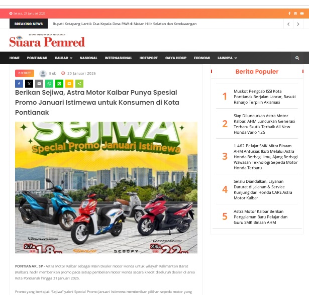 Berikan Sejiwa, Astra Motor Kalbar Punya Spesial Promo Januari Istimewa untuk Konsumen di Kota Pontianak by masmul 20 Januari 2026 in Silahkan kunjungi https://www.suarapemredkalbar.com/read/potret/20012026/berikan-sejiwa-astra-motor-kalbar-punya-spesial-promo-januari-istimewa-untuk-konsumen-di-kota-pontianak. You Might Like Regional Public Launching New ADV160 The SUV Pride Grand Launching New PCX 160 Truly Exceptional! Tetap hati-hati ya bro sist berkendara saat hujan.