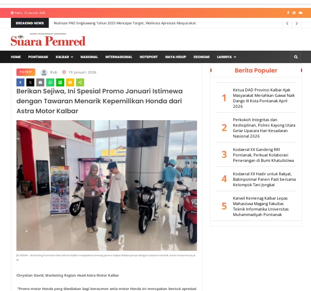 Berikan Sejiwa, Ini Spesial Promo Januari Istimewa dengan Tawaran Menarik Kepemilikan Honda dari Astra Motor Kalbar by masmul 19 Januari 2026 in Silahkan kunjungi https://www.suarapemredkalbar.com/read/potret/19012026/berikan-sejiwa-ini-spesial-promo-januari-istimewa-dengan-tawaran-menarik-kepemilikan-honda-dari-astra-motor-kalbar. You Might Like Regional Public Launching New ADV160 The SUV Pride Grand Launching New PCX 160 Truly Exceptional! Tetap hati-hati ya bro sist berkendara saat hujan.