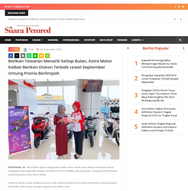 Berikan Tawaran Menarik Setiap Bulan, Astra Motor Kalbar Berikan Diskon Terbaik Lewat September Untung Promo Berlimpah by masmul 28 September 2025 in Silahkan kunjungi https://www.suarapemredkalbar.com/read/potret/28092025/berikan-tawaran-menarik-setiap-bulan-astra-motor-kalbar-berikan-diskon-terbaik-lewat-september-untung-promo-berlimpah. You Might Like Regional Public Launching New ADV160 The SUV Pride Grand Launching New PCX 160 Truly Exceptional! Tetap hati-hati ya bro sist berkendara saat hujan.