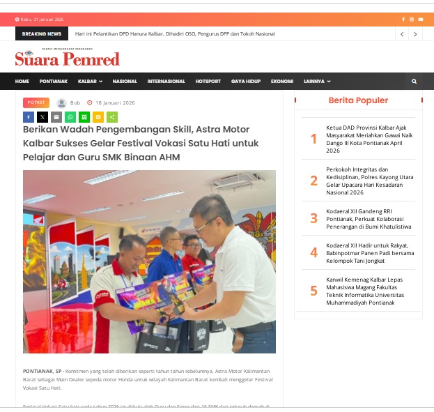 Berikan Wadah Pengembangan Skill, Astra Motor Kalbar Sukses Gelar Festival Vokasi Satu Hati untuk Pelajar dan Guru SMK Binaan AHM by masmul 18 Januari 2026 in Silahkan kunjungi https://www.suarapemredkalbar.com/read/potret/18012026/berikan-wadah-pengembangan-skill-astra-motor-kalbar-sukses-gelar-festival-vokasi-satu-hati-untuk-pelajar-dan-guru-smk-binaan-ahm. You Might Like Regional Public Launching New ADV160 The SUV Pride Grand Launching New PCX 160 Truly Exceptional! Tetap hati-hati ya bro sist berkendara saat hujan.