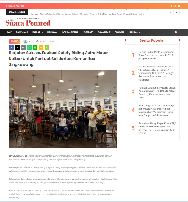 Berjalan Sukses, Edukasi Safety Riding Astra Motor Kalbar untuk Perkuat Solidaritas Komunitas Singkawang by masmul 18 April 2026 in Silahkan kunjungi https://www.suarapemredkalbar.com/read/potret/18042026/berjalan-sukses-edukasi-safety-riding-astra-motor-kalbar-untuk-perkuat-solidaritas-komunitas-singkawang. You Might Like Regional Public Launching New ADV160 The SUV Pride Grand Launching New PCX 160 Truly Exceptional! Tetap hati-hati ya bro sist berkendara saat hujan.