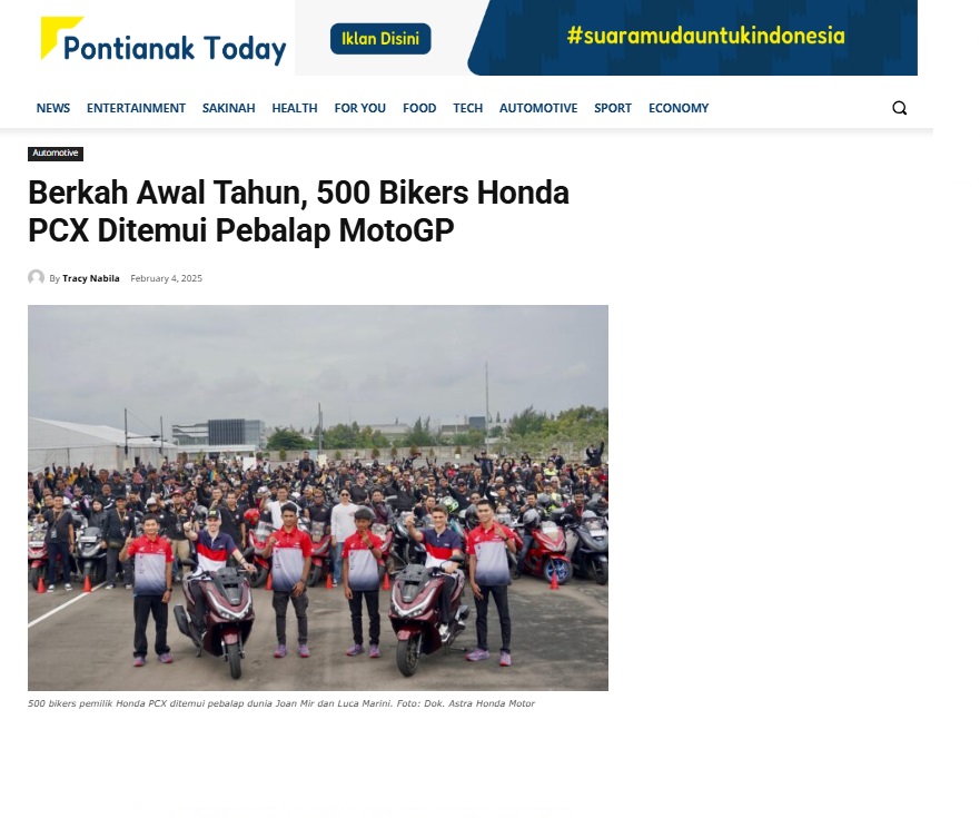 Berkah Awal Tahun, 500 Bikers Honda PCX Ditemui Pebalap MotoGP by Leo Prima 4 Februari 2025 in Silahkan kunjungi https://pontianaktoday.id/berkah-awal-tahun-500-bikers-honda-pcx-ditemui-pebalap-motogp/. Tags: Asmo Kalbar Astra Motor kalbar Honda Kalbar Honda PCX Motor Honda Pebalap MotoGP PT AHM You Might Like Regional Public Launching New ADV160 The SUV Pride Grand Launching New PCX 160 Truly Exceptional! Tetap hati-hati ya bro sist berkendara saat hujan.