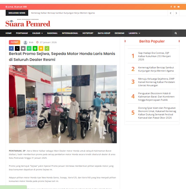 Berkat Promo Sejiwa, Sepeda Motor Honda Laris Manis di Seluruh Dealer Resmi by masmul 26 Januari 2026 in Silahkan kunjungi https://www.suarapemredkalbar.com/read/potret/27012026/berkat-promo-sejiwa-sepeda-motor-honda-laris-manis-di-seluruh-dealer-resmi. You Might Like Regional Public Launching New ADV160 The SUV Pride Grand Launching New PCX 160 Truly Exceptional! Tetap hati-hati ya bro sist berkendara saat hujan.