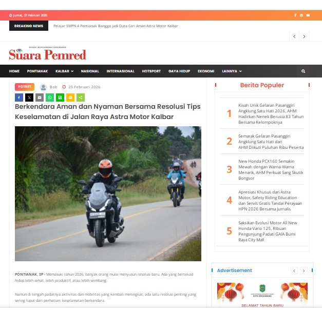 Berkendara Aman dan Nyaman Bersama Resolusi Tips Keselamatan di Jalan Raya Astra Motor Kalbar by masmul 25 Februari 2026 in Silahkan kunjungi https://www.suarapemredkalbar.com/read/potret/25022026/berkendara-aman-dan-nyaman-bersama-resolusi-tips-keselamatan-di-jalan-raya-astra-motor-kalbar. You Might Like Regional Public Launching New ADV160 The SUV Pride Grand Launching New PCX 160 Truly Exceptional! Tetap hati-hati ya bro sist berkendara saat hujan.