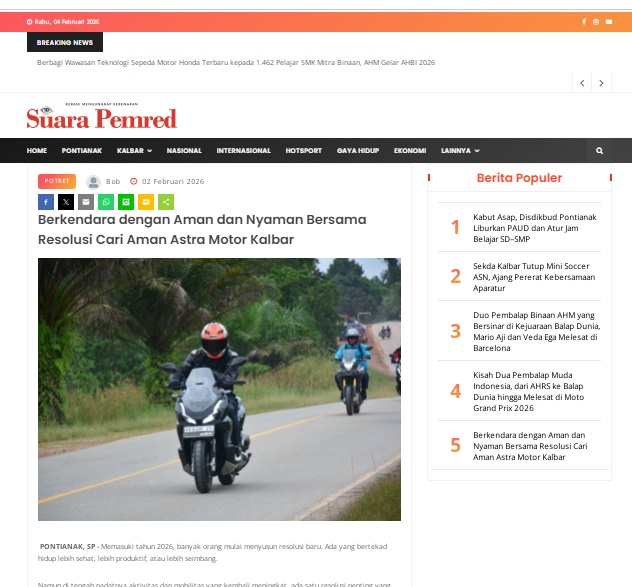 Berkendara dengan Aman dan Nyaman Bersama Resolusi Cari Aman Astra Motor Kalbar by masmul 2 Februari 2026 in Silahkan kunjungi https://www.suarapemredkalbar.com/read/potret/02022026/berkendara-dengan-aman-dan-nyaman-bersama-resolusi-cari-aman-astra-motor-kalbar. You Might Like Regional Public Launching New ADV160 The SUV Pride Grand Launching New PCX 160 Truly Exceptional! Tetap hati-hati ya bro sist berkendara saat hujan.