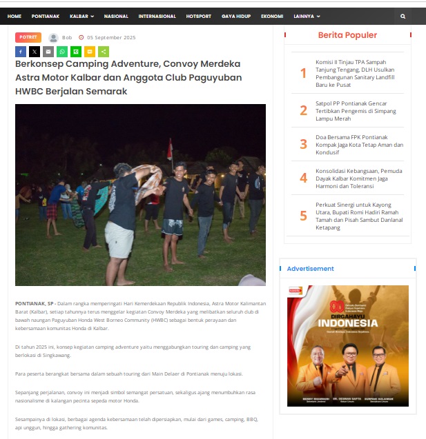 Berkonsep Camping Adventure, Convoy Merdeka Astra Motor Kalbar dan Anggota Club Paguyuban HWBC Berjalan Semarak by masmul 5 September 2025 in Silahkan kunjungi https://www.suarapemredkalbar.com/read/potret/05092025/berkonsep-camping-adventure-convoy-merdeka-astra-motor-kalbar-dan-anggota-club-paguyuban-hwbc-berjalan-semarak. You Might Like Regional Public Launching New ADV160 The SUV Pride Grand Launching New PCX 160 Truly Exceptional! Tetap hati-hati ya bro sist berkendara saat hujan.