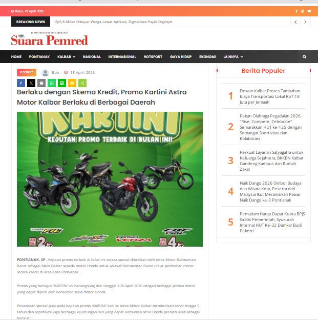 Berlaku dengan Skema Kredit, Promo Kartini Astra Motor Kalbar Berlaku di Berbagai Daerah by masmul 18 April 2026 in Silahkan kunjungi https://www.suarapemredkalbar.com/read/potret/18042026/berlaku-dengan-skema-kredit-promo-kartini-astra-motor-kalbar-berlaku-di-berbagai-daerah. You Might Like Regional Public Launching New ADV160 The SUV Pride Grand Launching New PCX 160 Truly Exceptional! Tetap hati-hati ya bro sist berkendara saat hujan.