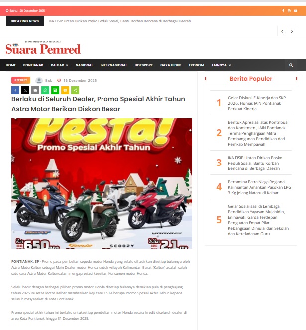 Berlaku di Seluruh Dealer, Promo Spesial Akhir Tahun Astra Motor Berikan Diskon Besar by masmul 16 Desember 2025 in Silahkan kunjungi https://www.suarapemredkalbar.com/read/potret/16122025/berlaku-di-seluruh-dealer-promo-spesial-akhir-tahun-astra-motor-berikan-diskon-besar. You Might Like Regional Public Launching New ADV160 The SUV Pride Grand Launching New PCX 160 Truly Exceptional! Tetap hati-hati ya bro sist berkendara saat hujan.