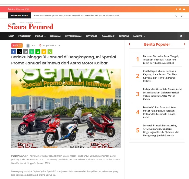Berlaku hingga 31 Januari di Bengkayang, Ini Spesial Promo Januari Istimewa dari Astra Motor Kalbar by masmul 23 Januari 2026 in Silahkan kunjungi https://www.suarapemredkalbar.com/read/potret/23012026/berlaku-hingga-31-januari-di-bengkayang-ini-spesial-promo-januari-istimewa-dari-astra-motor-kalbar. You Might Like Regional Public Launching New ADV160 The SUV Pride Grand Launching New PCX 160 Truly Exceptional! Tetap hati-hati ya bro sist berkendara saat hujan.