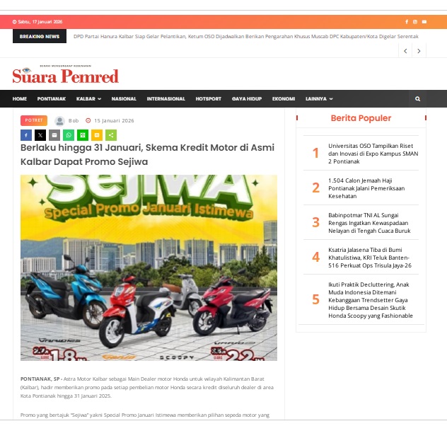 Berlaku hingga 31 Januari, Skema Kredit Motor di Asmi Kalbar Dapat Promo Sejiwa by masmul 15 Januari 2026 in Silahkan kunjungi https://www.suarapemredkalbar.com/read/potret/15012026/berlaku-hingga-31-januari-skema-kredit-motor-di-asmi-kalbar-dapat-promo-sejiwa. You Might Like Regional Public Launching New ADV160 The SUV Pride Grand Launching New PCX 160 Truly Exceptional! Tetap hati-hati ya bro sist berkendara saat hujan.