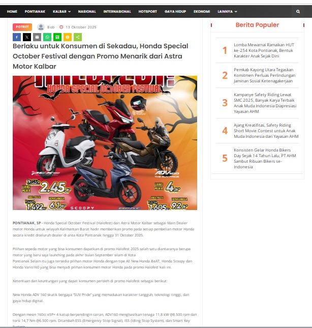 Berlaku untuk Konsumen di Sekadau, Honda Special October Festival dengan Promo Menarik dari Astra Motor Kalbar by masmul 13 Oktober 2025 in Silahkan kunjungi https://www.suarapemredkalbar.com/read/potret/13102025/berlaku-untuk-konsumen-di-sekadau-honda-special-october-festival-dengan-promo-menarik-dari-astra-motor-kalbar. You Might Like Regional Public Launching New ADV160 The SUV Pride Grand Launching New PCX 160 Truly Exceptional! Tetap hati-hati ya bro sist berkendara saat hujan.