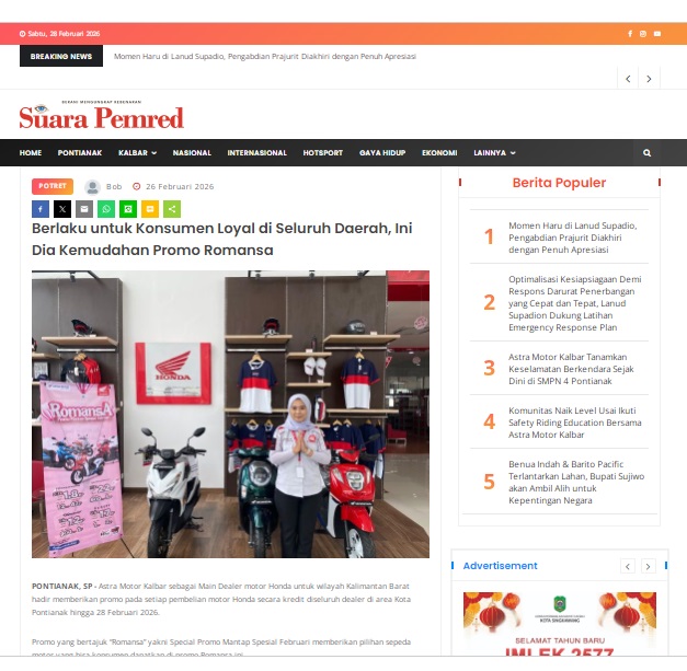 Berlaku untuk Konsumen Loyal di Seluruh Daerah, Ini Dia Kemudahan Promo Romansa by masmul 26 Februari 2026 in Silahkan kunjungi https://www.suarapemredkalbar.com/read/potret/26022026/berlaku-untuk-konsumen-loyal-di-seluruh-daerah-ini-dia-kemudahan-promo-romansa. You Might Like Regional Public Launching New ADV160 The SUV Pride Grand Launching New PCX 160 Truly Exceptional! Tetap hati-hati ya bro sist berkendara saat hujan.