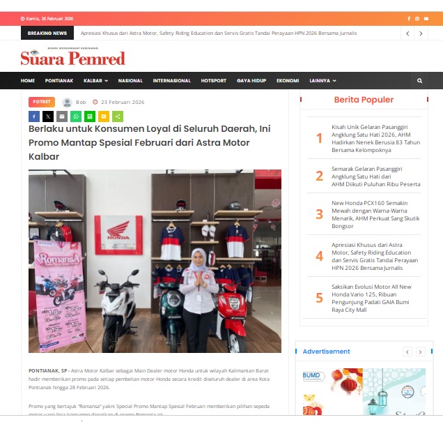 Berlaku untuk Konsumen Loyal di Seluruh Daerah, Ini Promo Mantap Spesial Februari dari Astra Motor Kalbar by masmul 23 Februari 2026 in Silahkan kunjungi https://www.suarapemredkalbar.com/read/potret/23022026/berlaku-untuk-konsumen-loyal-diseluruh-daerah-ini-promo-mantap-spesial-februari-dari-astra-motor-kalbar. You Might Like Regional Public Launching New ADV160 The SUV Pride Grand Launching New PCX 160 Truly Exceptional! Tetap hati-hati ya bro sist berkendara saat hujan.