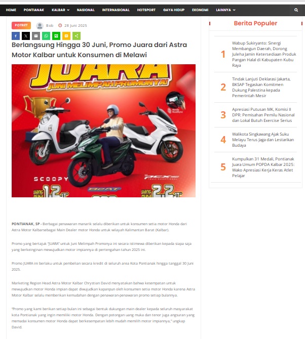 Berlangsung Hingga 30 Juni, Promo Juara dari Astra Motor Kalbar untuk Konsumen di Melawi by masmul 28 Juni 2025 in Silahkan kunjungi https://www.suarapemredkalbar.com/read/potret/28062025/berlangsung-hingga-30-juni-promo-juara-dari-astra-motor-kalbar-untuk-konsumen-di-melawi. You Might Like Regional Public Launching New ADV160 The SUV Pride Grand Launching New PCX 160 Truly Exceptional! Tetap hati-hati ya bro sist berkendara saat hujan.