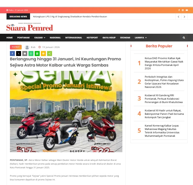 Berlangsung hingga 31 Januari, Ini Keuntungan Promo Sejiwa Astra Motor Kalbar untuk Warga Sambas by masmul 19 Januari 2026 in Silahkan kunjungi https://www.suarapemredkalbar.com/read/potret/19012026/berlangsung-hingga-31-januari-ini-keuntungan-promo-sejiwa-astra-motor-kalbar-untuk-warga-sambas. You Might Like Regional Public Launching New ADV160 The SUV Pride Grand Launching New PCX 160 Truly Exceptional! Tetap hati-hati ya bro sist berkendara saat hujan.
