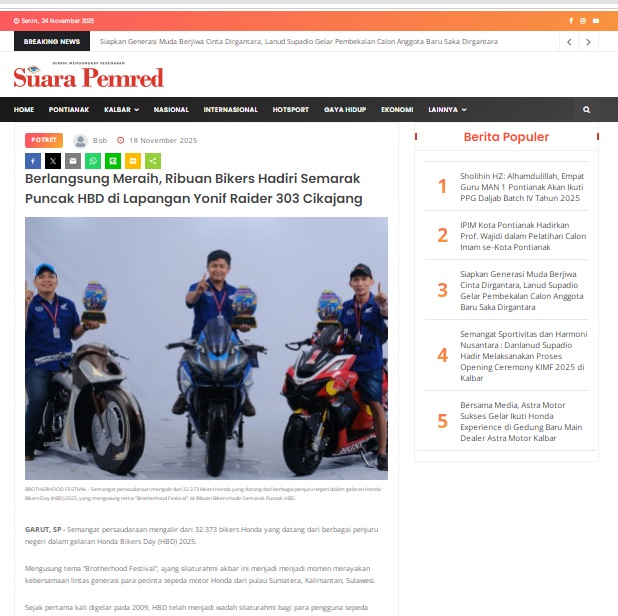 Berlangsung Meraih, Ribuan Bikers Hadiri Semarak Puncak HBD di Lapangan Yonif Raider 303 Cikajang by masmul 18 November 2025 in Silahkan kunjungi https://www.suarapemredkalbar.com/read/potret/18112025/berlangsung-meraih-ribuan-bikers-hadiri-semarak-puncak-hbd-di-lapangan-yonif-raider-303-cikajang. You Might Like Regional Public Launching New ADV160 The SUV Pride Grand Launching New PCX 160 Truly Exceptional! Tetap hati-hati ya bro sist berkendara saat hujan.